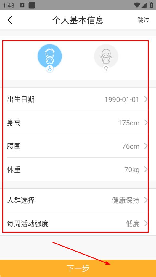 3、在個人基本信息頁面,填寫性別、出生日期、身高、體重、人群選擇、每周活動強度等信息,點擊下一步。