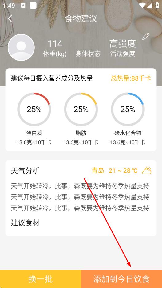 4、返回食物建議頁面,查看每日攝入營養(yǎng)成分及熱量建議,以及推薦食材,點擊添加到今日飲食。