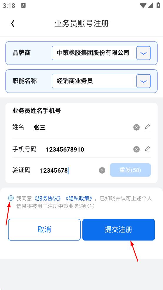 4、勾選我同意服務(wù)協(xié)議和隱私政策,確認(rèn)信息無(wú)誤后,點(diǎn)擊提交注冊(cè)按鈕。