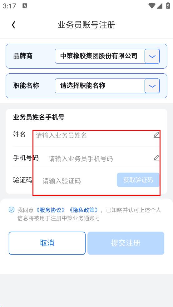 3、在注冊(cè)界面,選擇品牌商和職能名稱(chēng),然后輸入業(yè)務(wù)員姓名、手機(jī)號(hào)碼,點(diǎn)擊獲取驗(yàn)證碼并輸入。