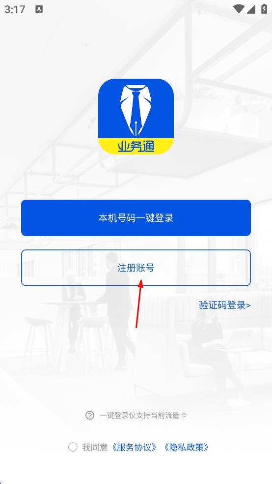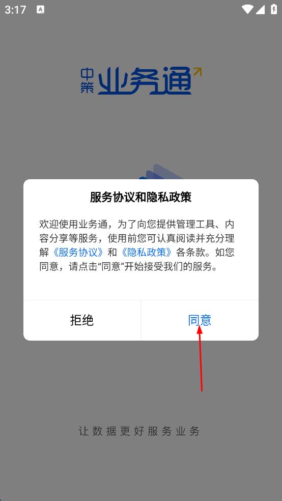 1、打開(kāi)業(yè)務(wù)通APP,出現(xiàn)服務(wù)協(xié)議和隱私政策彈窗,仔細(xì)閱讀內(nèi)容后,點(diǎn)擊同意按鈕。