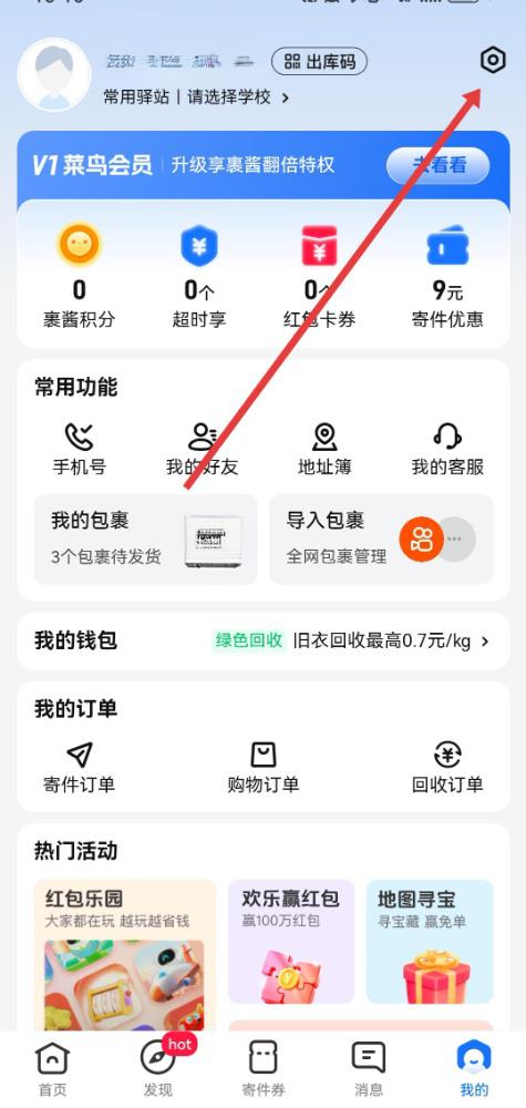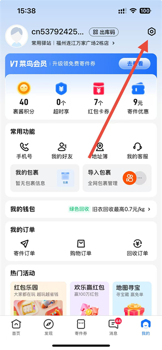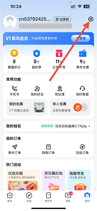 1、打開(kāi)菜鳥(niǎo)裹裹app,在我的頁(yè)面點(diǎn)擊右上角設(shè)置圖標(biāo),進(jìn)入設(shè)置界面。