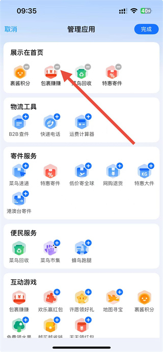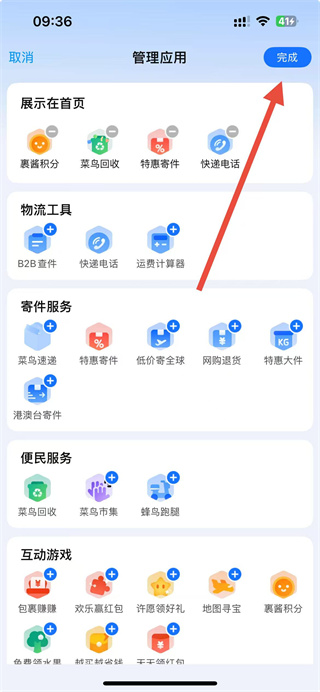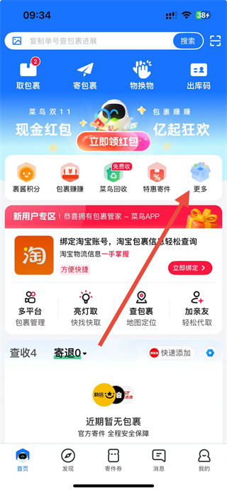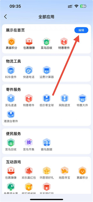 1、在菜鳥(niǎo)app首頁(yè),點(diǎn)擊更多選項(xiàng),進(jìn)入全部應(yīng)用頁(yè)面。