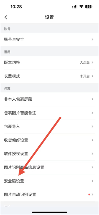 2、在設(shè)置界面,點(diǎn)擊安全碼設(shè)置選項(xiàng),進(jìn)入安全碼設(shè)置頁(yè)面。