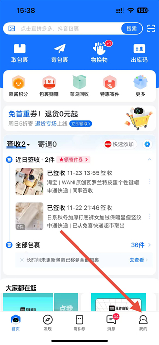 1、進(jìn)入菜鳥(niǎo)主界面后,點(diǎn)擊底部導(dǎo)航欄最右側(cè)的我的選項(xiàng)。