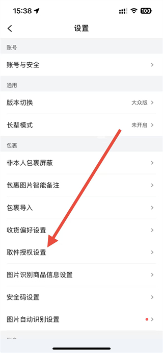 3、在設(shè)置界面中,找到并點(diǎn)擊取件授權(quán)設(shè)置選項(xiàng)。