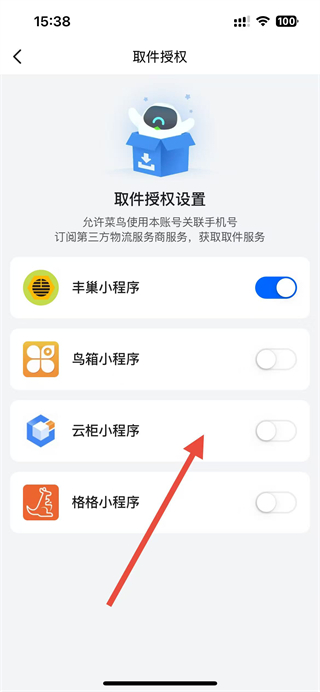 4、進(jìn)入取件授權(quán)的管理頁(yè)面,可在此開(kāi)啟或關(guān)閉小程序的取件授權(quán)。