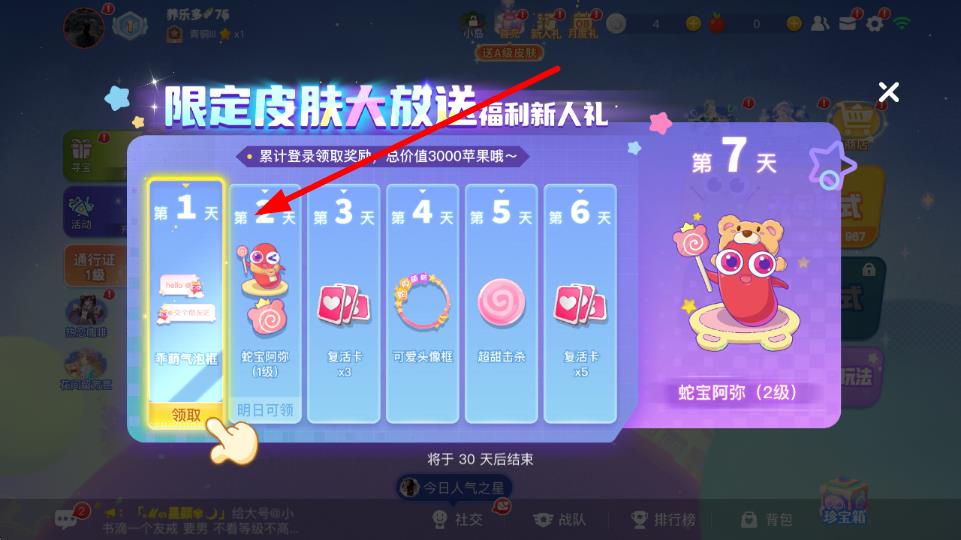 2、在打開的限定皮膚大放送 福利新人禮界面中,能看到累計登錄領取獎勵的天數(shù)欄 ,即可領取對應禮包,像乖萌氣泡框等獎勵。