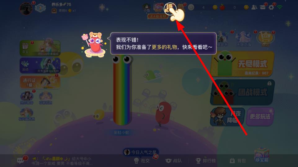 1、進入貪吃蛇大作戰(zhàn)游戲主界面,留意界面上方出現(xiàn)的提示信息,點擊提示中手指所指的位置,進入禮包領取界面。