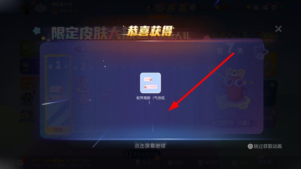 3、點擊領取按鈕后,會彈出恭喜獲得獎勵的界面,顯示獲得的具體物品,比如蛇界萌新氣泡框 。完成禮包領取操作,之后可以在游戲中使用。