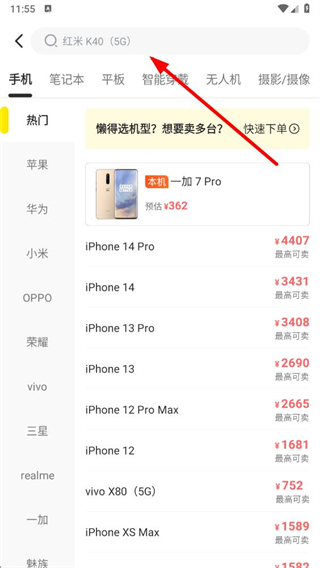 3、在機(jī)型選擇頁(yè)面搜索或選擇要估價(jià)的機(jī)型,進(jìn)入手機(jī)估價(jià)頁(yè)面。