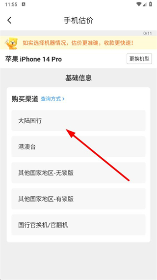 4、在手機(jī)估價(jià)頁(yè)面選擇購(gòu)買(mǎi)渠道等基礎(chǔ)信息,按提示完成后續(xù)估價(jià)流程,即可完成估價(jià)操作。
