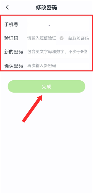 4、在頁面填寫手機號、驗證碼及新密碼后,點擊完成,完成密碼修改操作。