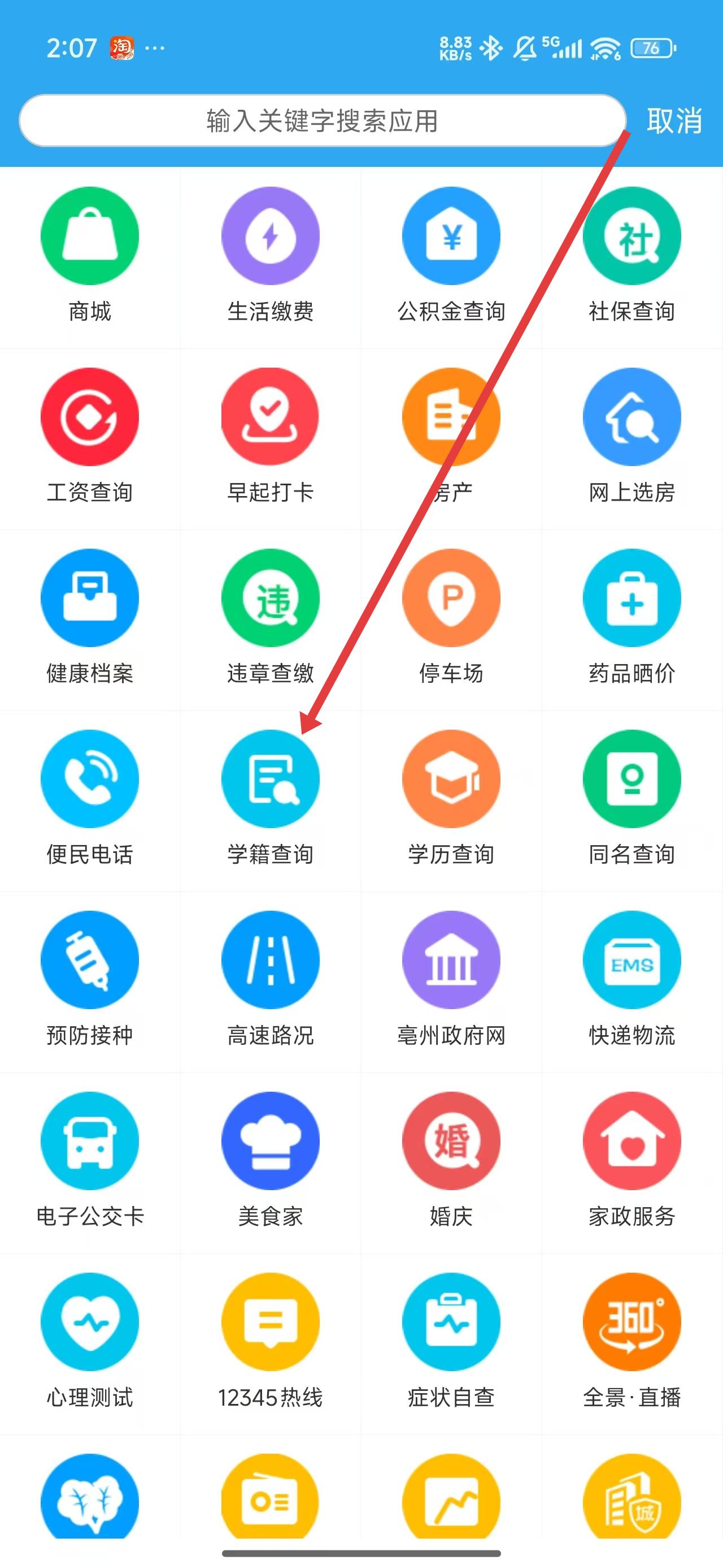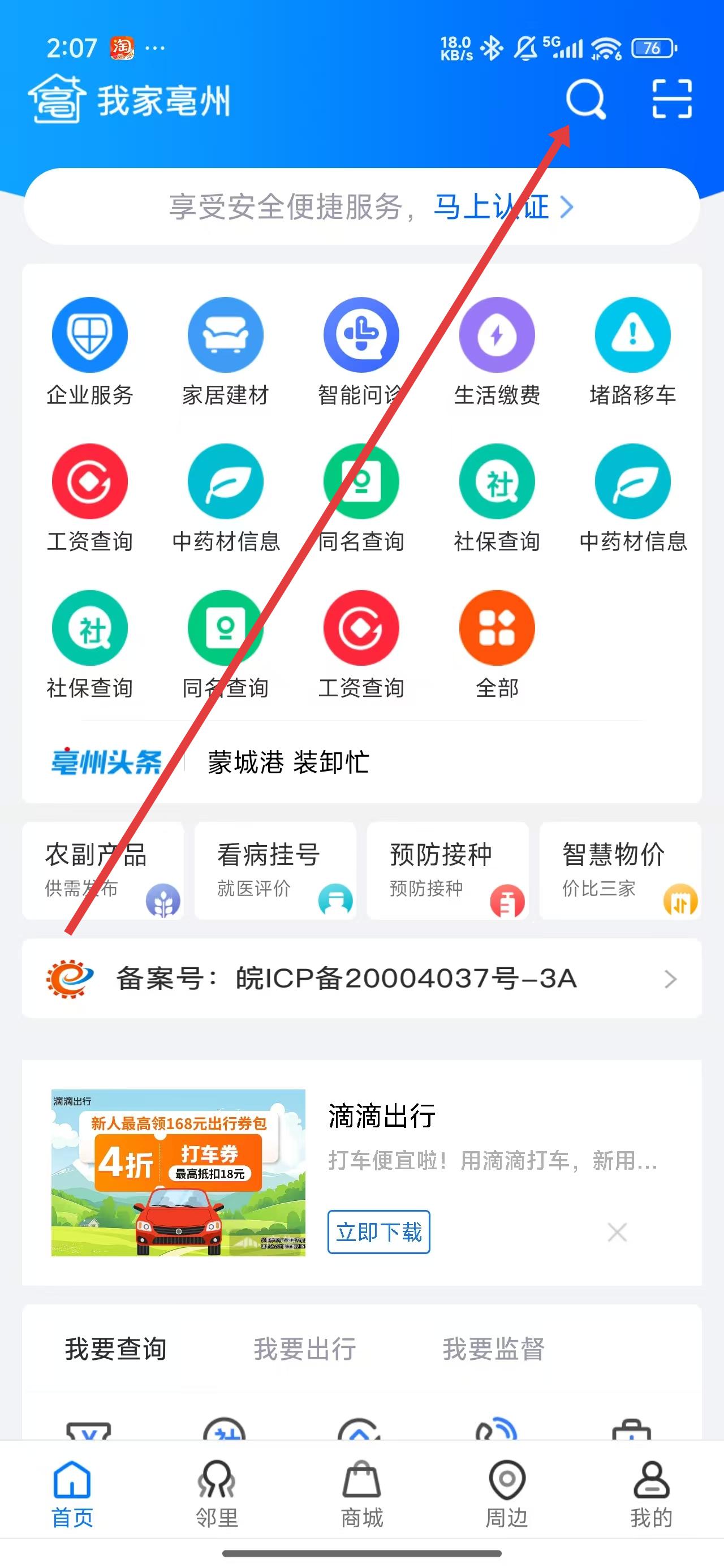 1、在我家亳州應用首頁中,點擊頂部的放大鏡搜索圖標,查看更多功能。