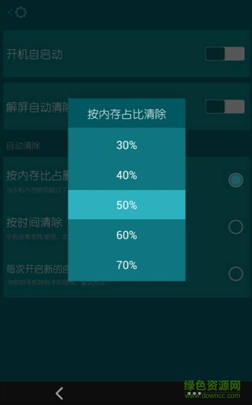 1、按內(nèi)存比占清除手機內(nèi)存。(但手機使用內(nèi)存超過你設(shè)置的50%的時候,就會自動清除內(nèi)存)