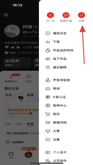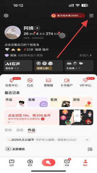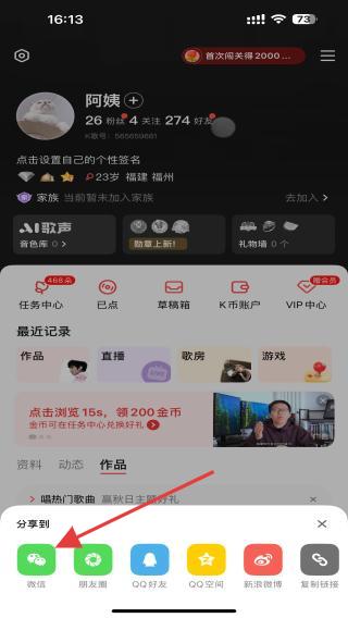 1、打開全民k歌的APP,進入時點擊右側分享的圖標。