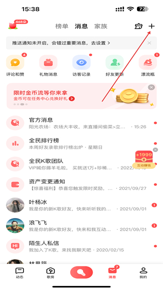 2、進入消息的界面內,用戶需點擊右上角+的功能圖標。