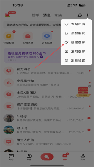 3、在右上彈出的菜單欄中,找到并點擊創(chuàng)建群聊的按鈕。