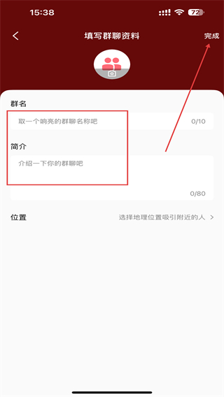 4、輸入群名、簡介后,再點擊右上角完成的按鈕即可成功。