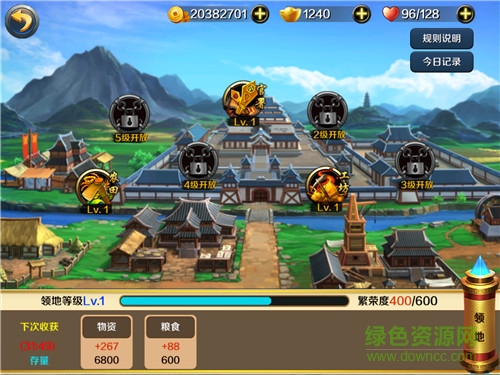 4.在系統(tǒng)玩法上,副本關(guān)卡、玩家掠奪、競技場以及一些日?;顒痈北九c傳統(tǒng)的動作卡牌游戲并無多大不同;值得一提的是本作的“領(lǐng)地”玩法,升級官署,開發(fā)工坊、農(nóng)田等玩法頗有模擬經(jīng)營的樂趣,隨著官署等級的提升,也將有越來越多的建筑可以解鎖,將武將派駐到這些建筑中駐守后,每隔一段時間還會產(chǎn)出豐富的資源。除此之外,每天限數(shù)的領(lǐng)地任務也能為玩家?guī)泶罅康馁Y源。
