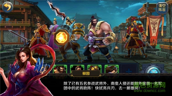玩家最多可以選擇5名武將參與戰(zhàn)斗。各種職業(yè)等級可以選擇比較互利的進(jìn)行搭配,我方共有5個出戰(zhàn)位置:前排、中排左側(cè)、中排右側(cè)、后排左側(cè)、后排右側(cè)。而且在戰(zhàn)斗前玩家可以調(diào)整每個武將的出戰(zhàn)位置,這里的武將搭配和位置的合理放置也是很有利樂趣和開洞大腦的一部分玩法。