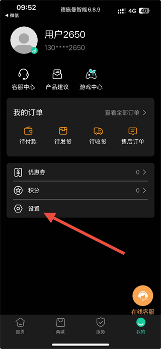 1、在德施曼智能app我的頁面點(diǎn)擊設(shè)置選項(xiàng),進(jìn)入設(shè)置頁面。