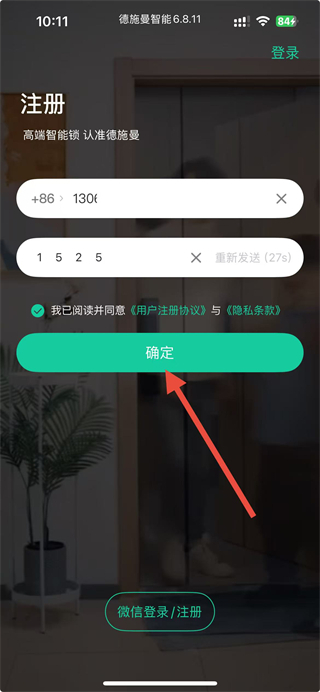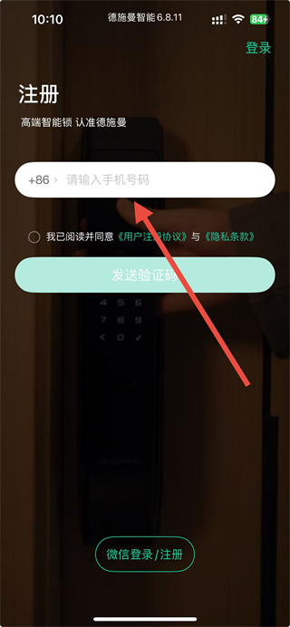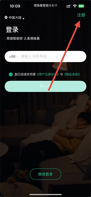 1、打開德施曼智能app,在登錄頁面點(diǎn)擊右上角注冊選項(xiàng),進(jìn)入注冊頁面。
