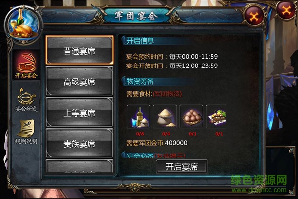 不同的宴會(huì)等級(jí)所對(duì)應(yīng)的開(kāi)啟條件是不一樣的,開(kāi)啟宴會(huì)需要消耗宴會(huì)等級(jí)所對(duì)應(yīng)的軍團(tuán)資金以及食材。