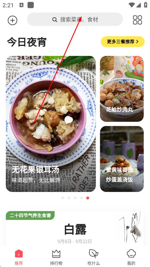 1、打開(kāi)美食杰App,點(diǎn)擊首頁(yè)上方的搜索欄,輸入想要查找的菜譜關(guān)鍵詞。