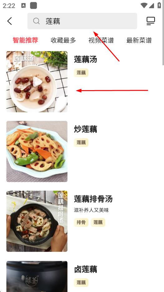 2、輸入關(guān)鍵詞后,界面會(huì)跳轉(zhuǎn)顯示相關(guān)菜譜列表,選擇你感興趣的菜譜。