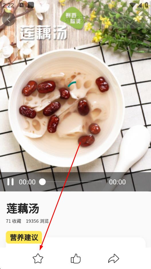 3、點(diǎn)擊進(jìn)入菜譜詳情頁(yè),可看到下方有收藏圖標(biāo),點(diǎn)擊該圖標(biāo),即可收藏。