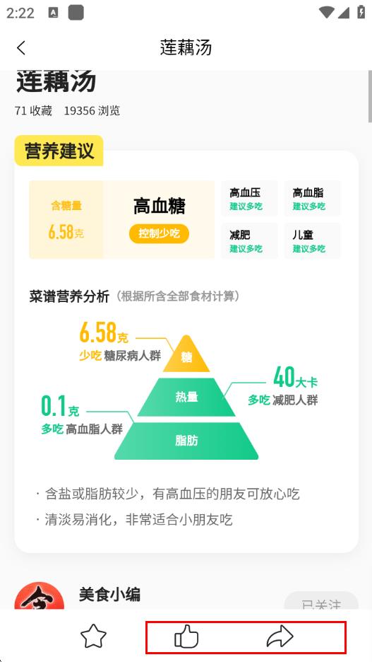 4、收藏成功后,在菜譜詳情頁(yè)能查看該菜譜針對(duì)不同人群的營(yíng)養(yǎng)建議等內(nèi)容,也可進(jìn)行點(diǎn)贊、分享等操作。