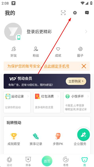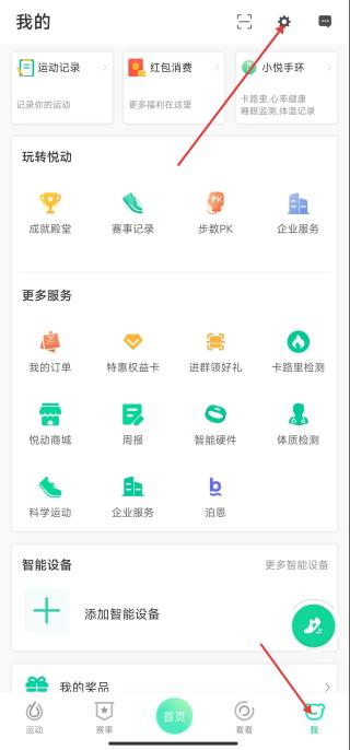 1、打開悅動圈APP,點(diǎn)擊底部導(dǎo)航欄我的進(jìn)入個(gè)人中心,找到右上角齒輪狀設(shè)置圖標(biāo)并點(diǎn)擊,進(jìn)入設(shè)置界面。