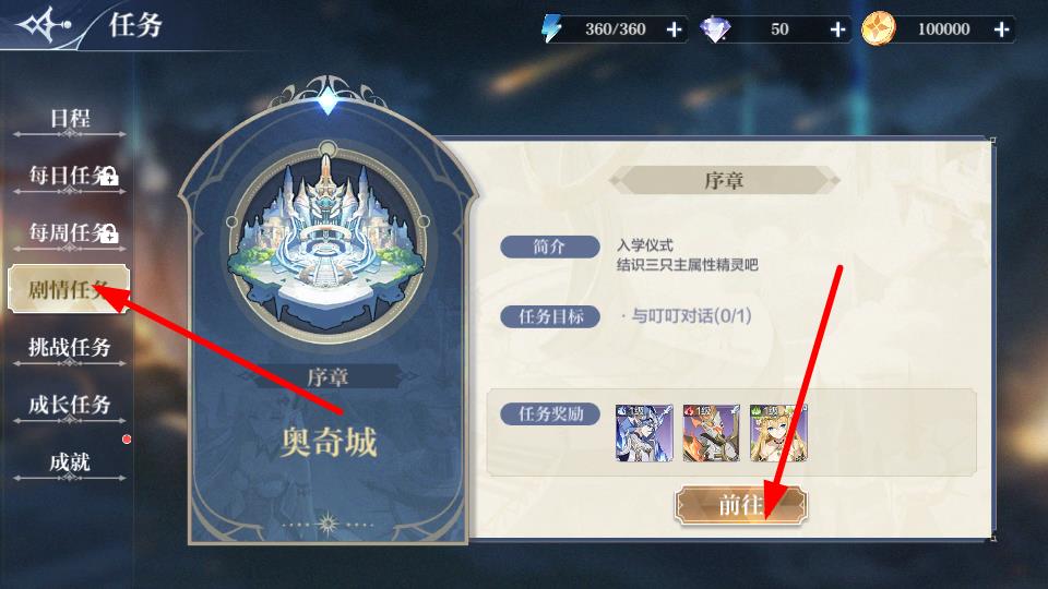 3、點(diǎn)擊左側(cè)的任務(wù)按鈕,選擇劇情任務(wù),查看任務(wù)目標(biāo),比如序章中與叮叮對話,確認(rèn)后點(diǎn)擊前往,按指引完成任務(wù)獲取獎勵。