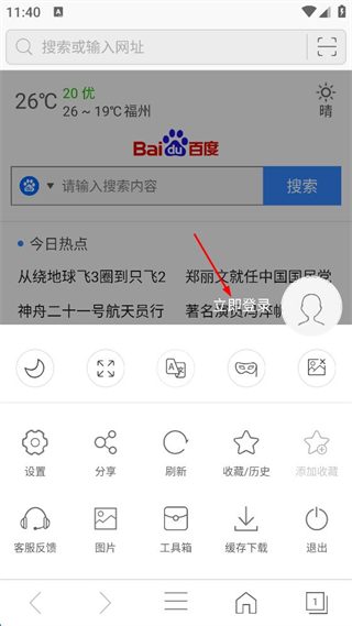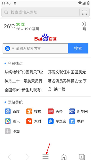 1、進入瀏覽器首頁,點擊下方三條橫線圖標。