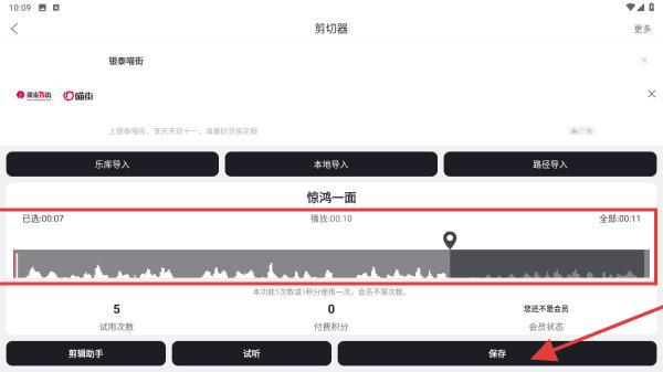 4、在此區(qū)域內(nèi),可對(duì)音樂進(jìn)行剪切,剪切后再點(diǎn)擊保存的按鈕即可。