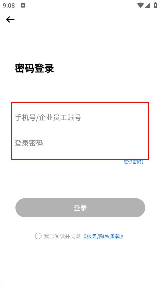 4、在密碼登錄頁面,輸入手機號/企業(yè)員工賬號和登錄密碼,后點擊“登錄”按鈕。
