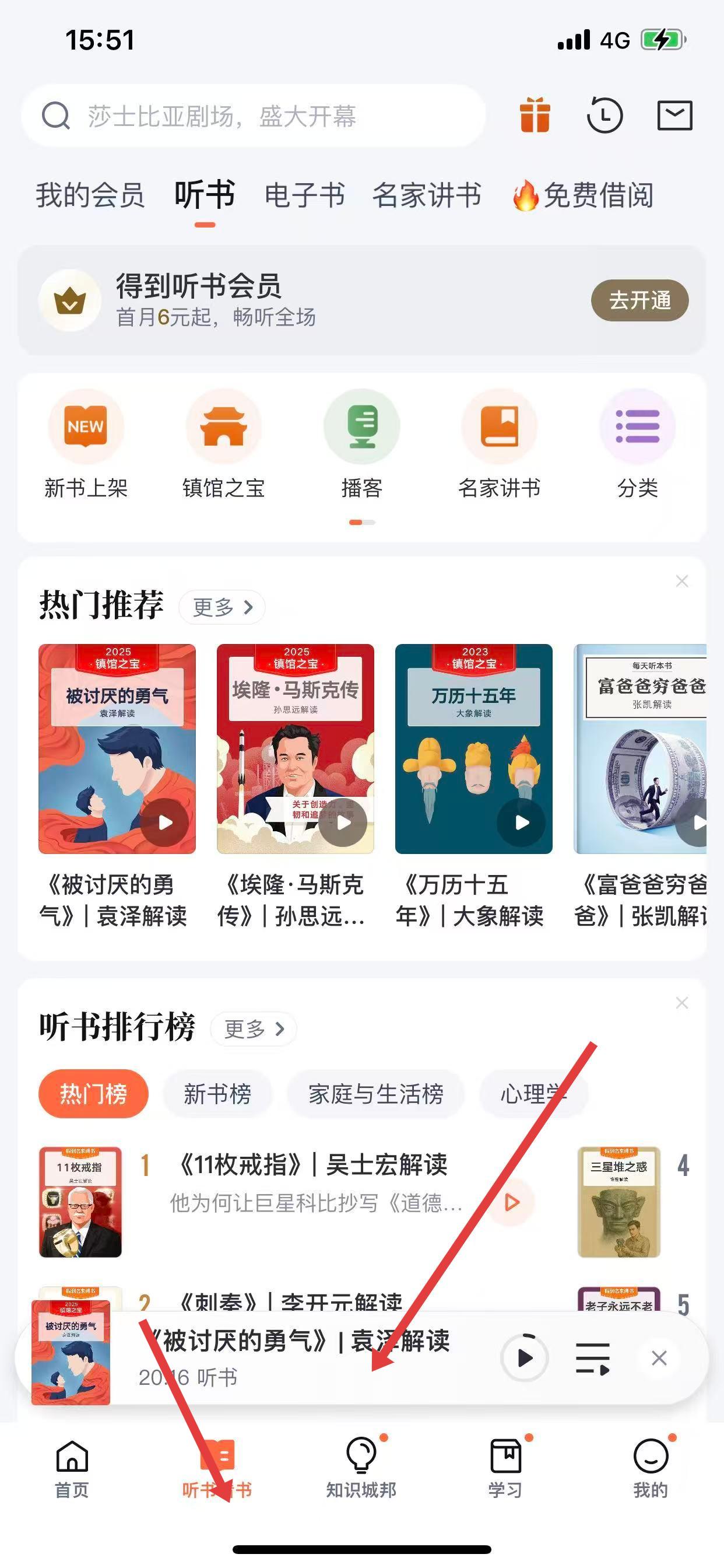 1、打開得到App,點(diǎn)擊底部導(dǎo)航欄中的聽書看書,選擇想要聽或看的內(nèi)容并進(jìn)入播放頁面。