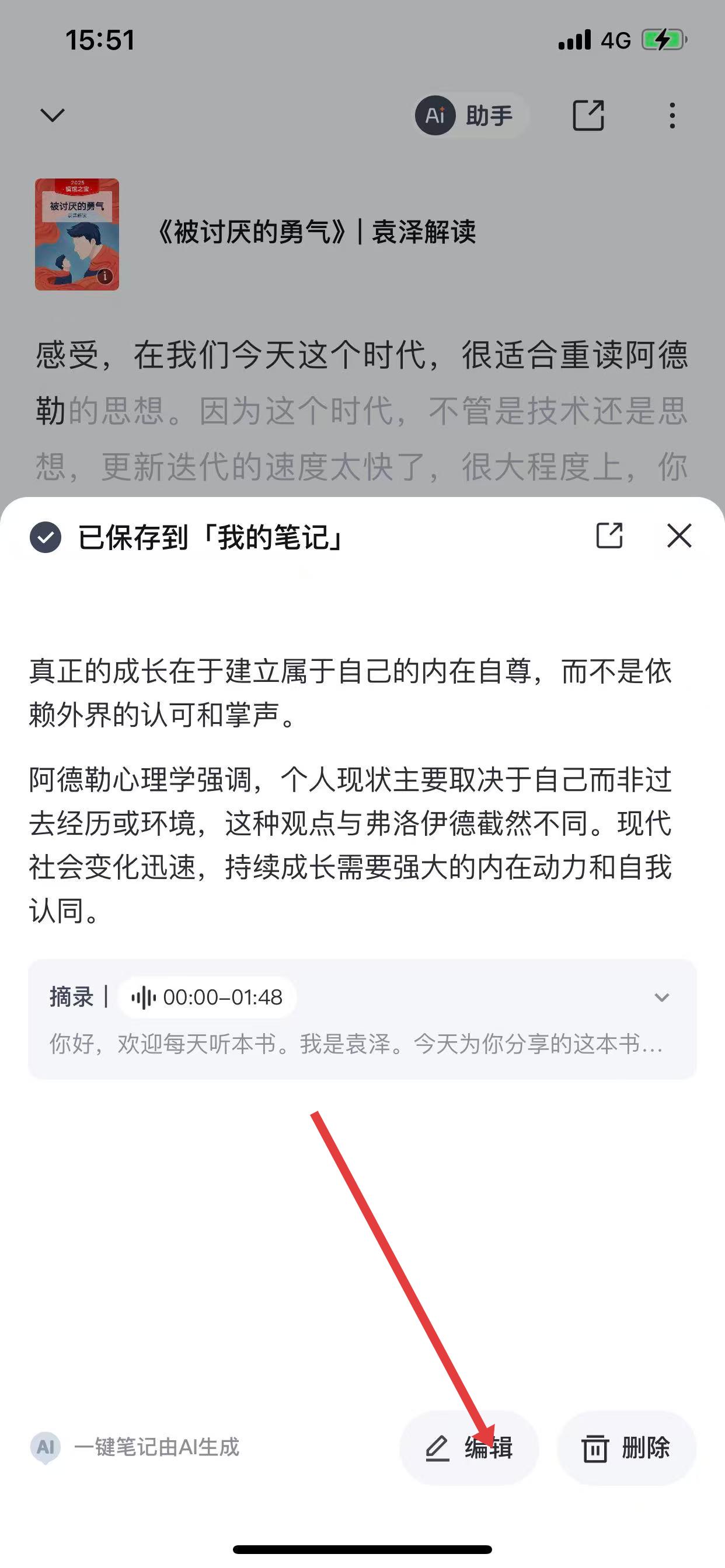 3、點(diǎn)擊后會生成初步的筆記內(nèi)容,點(diǎn)擊編輯可以對筆記進(jìn)行修改、完善。