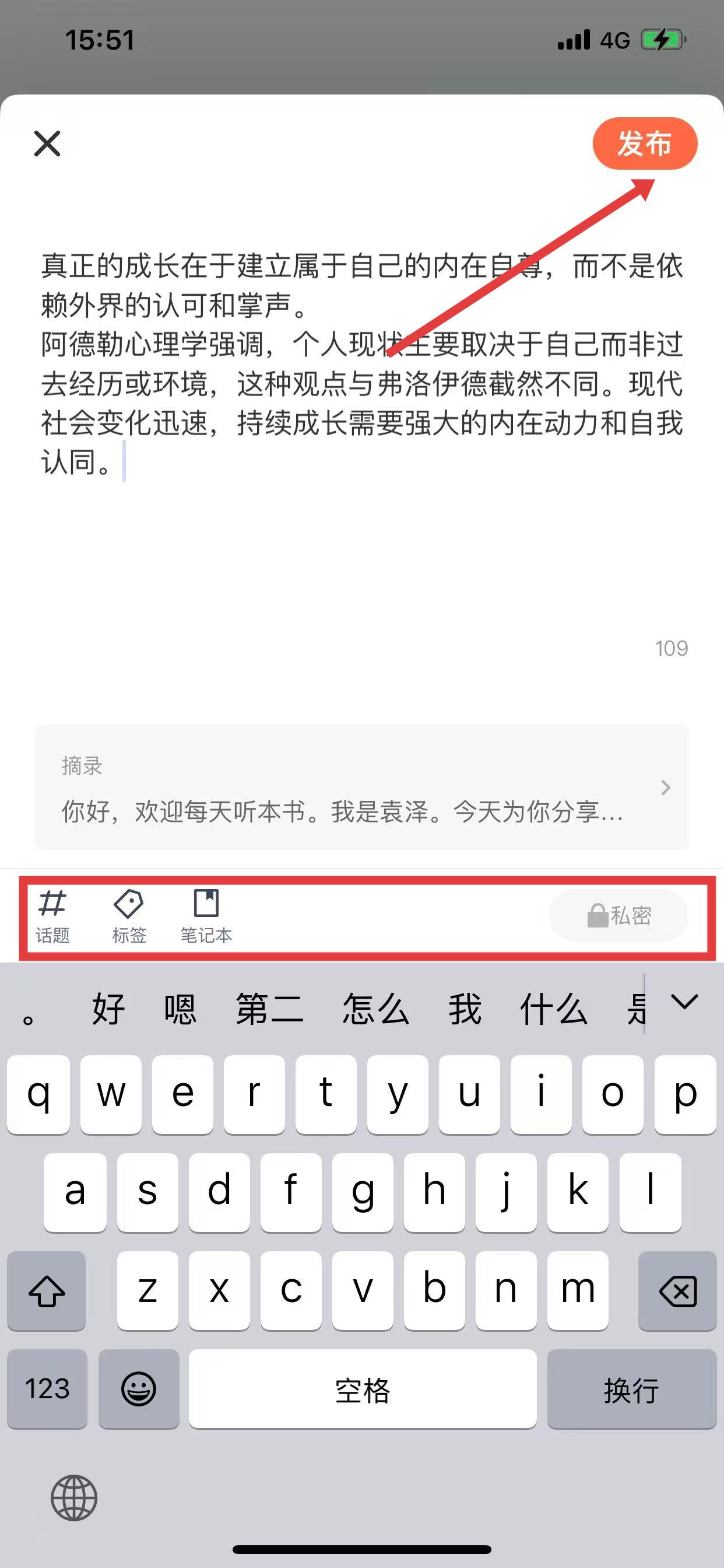 4、在編輯界面,可以添加話題、標(biāo)簽,選擇筆記本分類,設(shè)置筆記的公開或私密狀態(tài)等,點(diǎn)擊發(fā)布即可保存筆記。