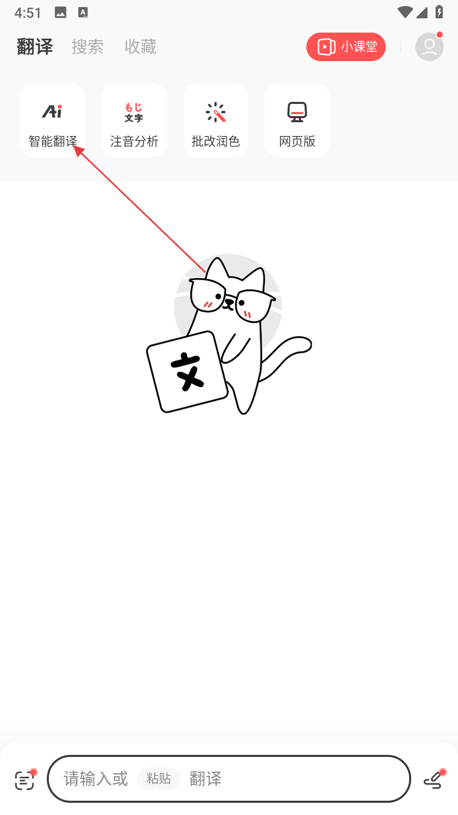1、打開moji辭書應(yīng)用,點(diǎn)擊頁(yè)面上方智能翻譯選項(xiàng),進(jìn)入對(duì)話式翻譯界面。