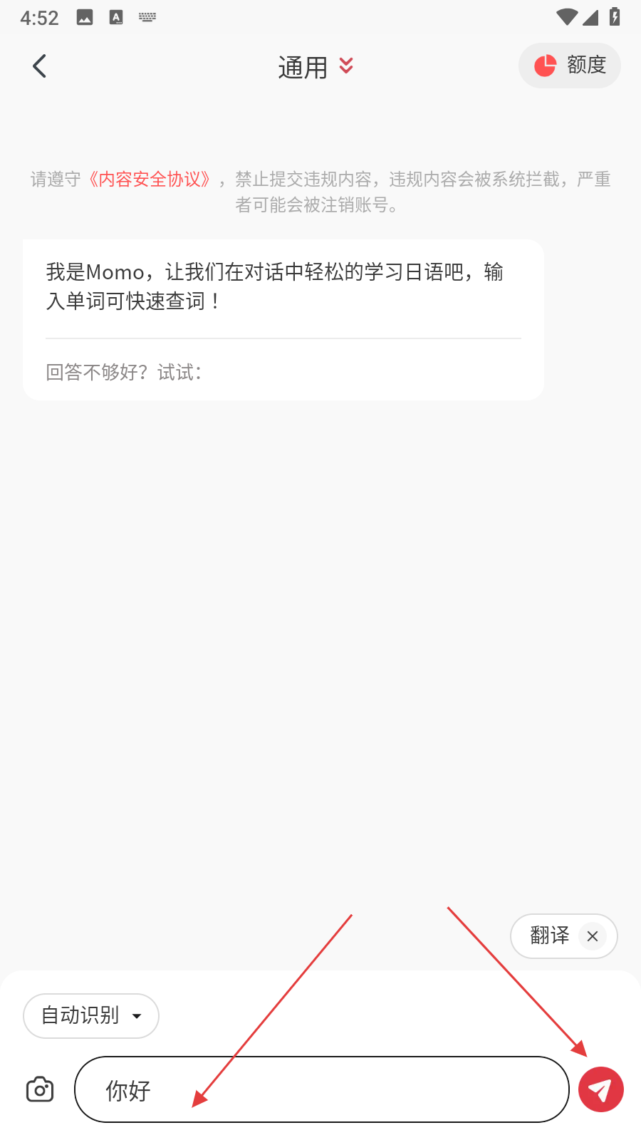 2、在界面底部輸入框中輸入需要翻譯的內(nèi)容,輸入完成后點(diǎn)擊右側(cè)紅色發(fā)送按鈕,提交內(nèi)容。