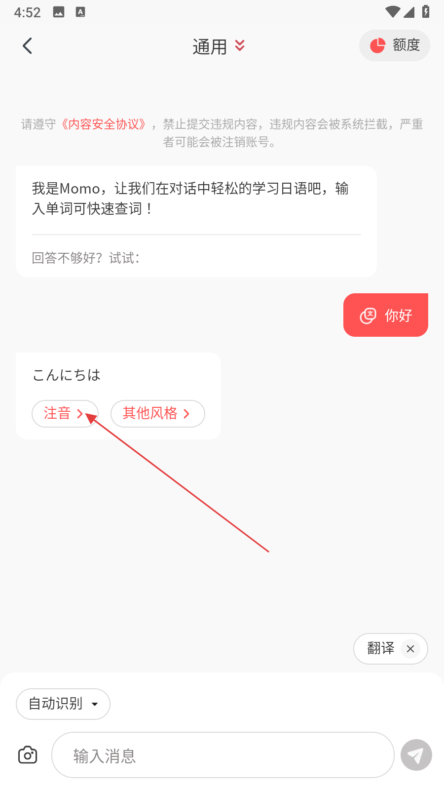 3、等待應(yīng)用返回翻譯結(jié)果,若需查看注音或其他風(fēng)格展示,可點(diǎn)擊翻譯結(jié)果下方的注音。