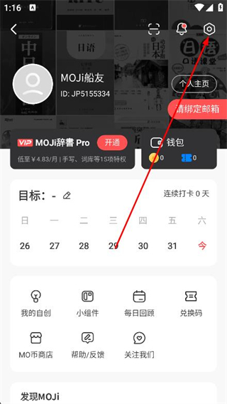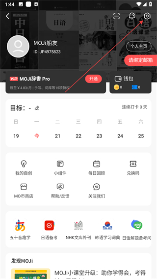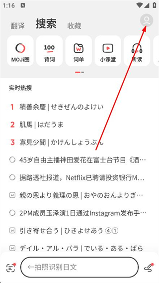 1、打開MOJi辭書應(yīng)用,點(diǎn)擊右上角的頭像圖標(biāo)。