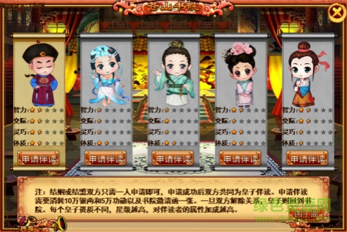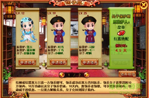 在后宮中自己沒有孩子也不要緊,可以去國子監(jiān)領(lǐng)養(yǎng)一個回來哦,不過領(lǐng)養(yǎng)也是有條件的,首先要結(jié)姻或者結(jié)盟雙方中的一個來領(lǐng)養(yǎng),還需要花費10萬功勛和10萬銀兩以及書院邀請函*1,領(lǐng)養(yǎng)成功后雙方共同撫養(yǎng),還可申請成為皇子伴讀陪她升級長大哦!