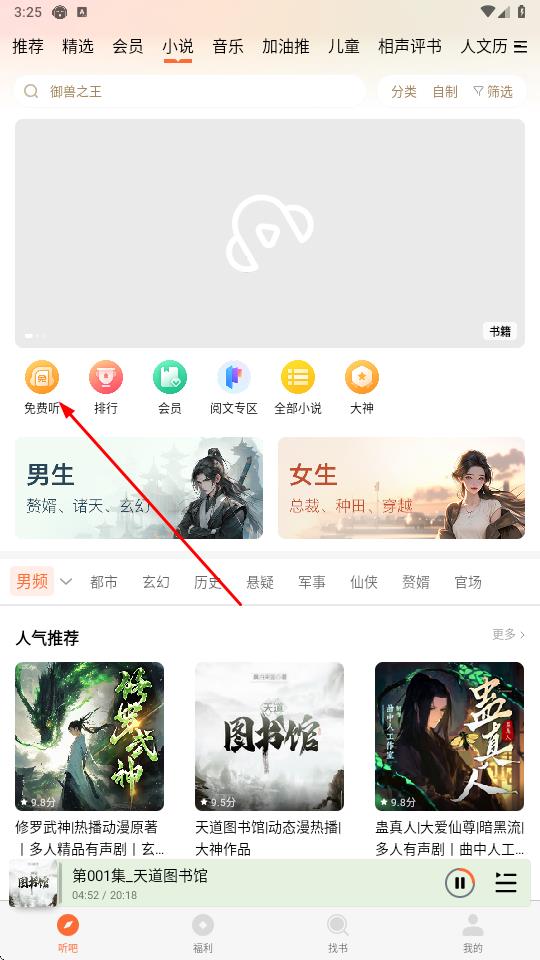 2、在小說(shuō)類別頁(yè)面,點(diǎn)擊【免費(fèi)聽(tīng)】按鈕,進(jìn)入免費(fèi)書(shū)籍專區(qū)。在這里,你可以看到各種免費(fèi)聽(tīng)書(shū)的分類和推薦。