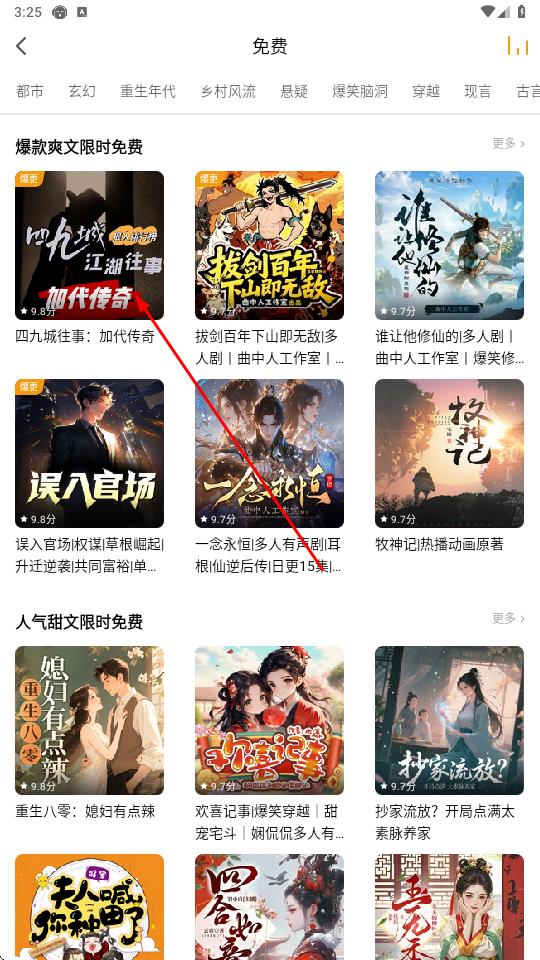 3、在免費(fèi)聽(tīng)書(shū)專區(qū),瀏覽【爆款爽文限時(shí)免費(fèi)】等欄目,找到感興趣的書(shū)籍,如《四九城往事:加代傳奇》,點(diǎn)擊書(shū)籍封面即可進(jìn)入書(shū)籍詳情頁(yè),開(kāi)始免費(fèi)收聽(tīng)。