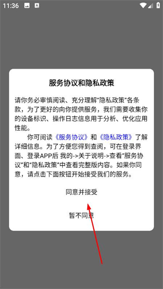 1、打開瑯智健康A(chǔ)PP,在服務(wù)協(xié)議和隱私政策彈窗中,點擊同意并接受。