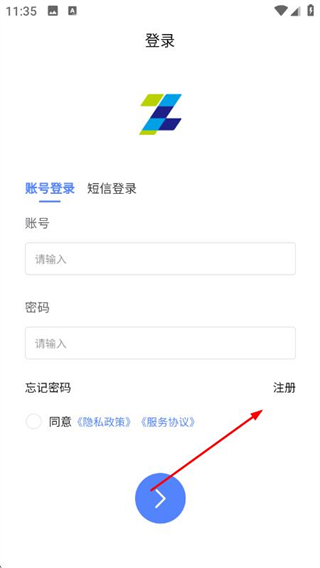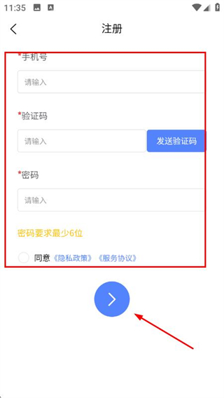 3、輸入手機號、驗證碼、設(shè)置密碼,勾選協(xié)議,點擊藍色箭頭按鈕,完成賬號注冊。