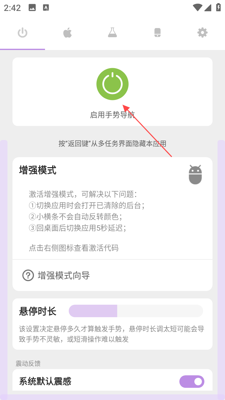 1、打開Gesture軟件,找到界面中啟用手勢導(dǎo)航綠色按鈕,點擊該按鈕,開啟手勢導(dǎo)航基礎(chǔ)功能,為后續(xù)手勢操作搭建使用前提,完成手勢功能啟用的第一步。